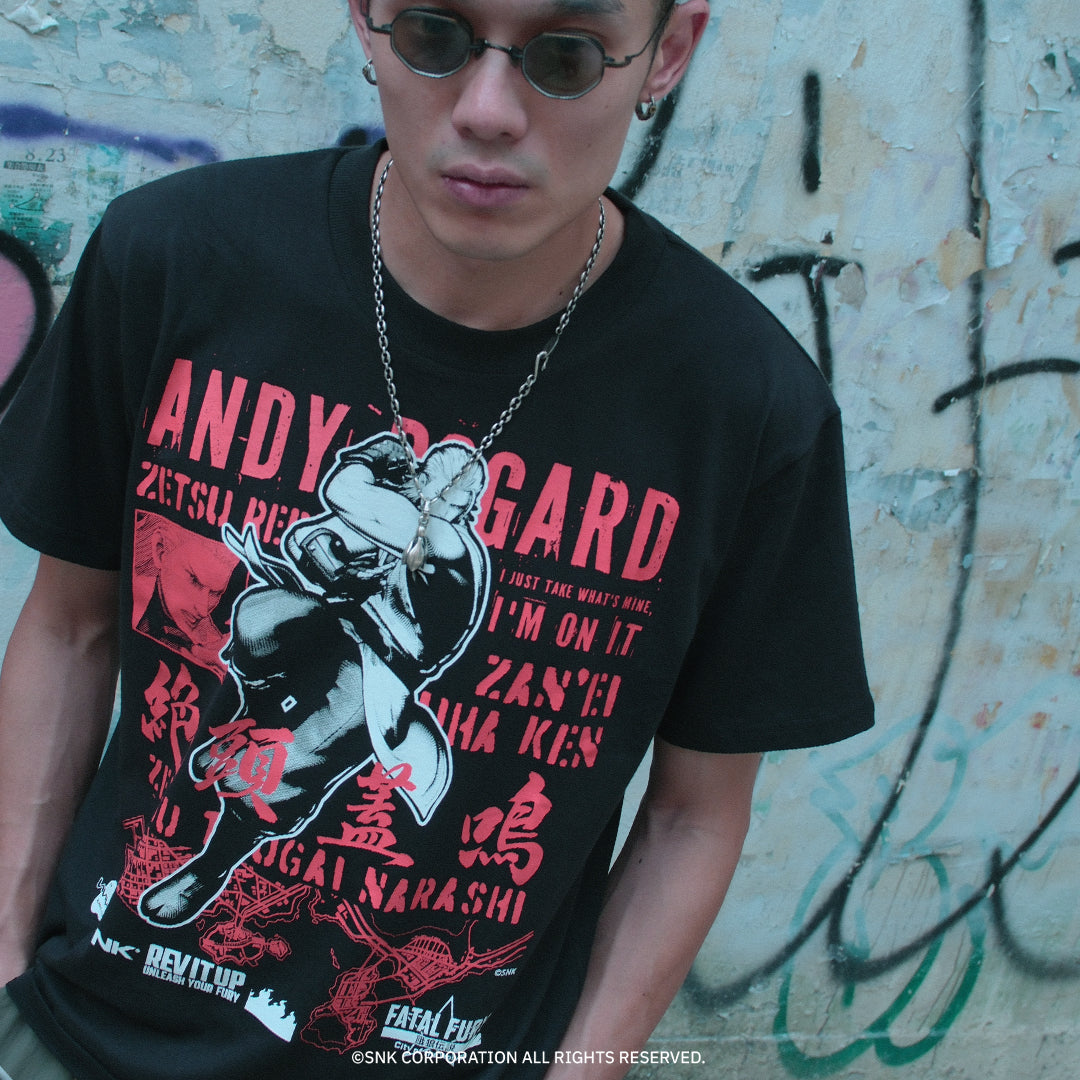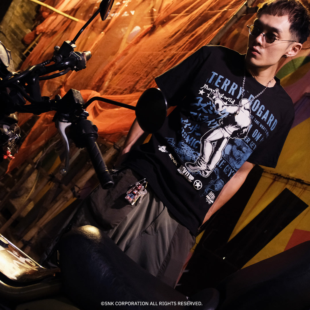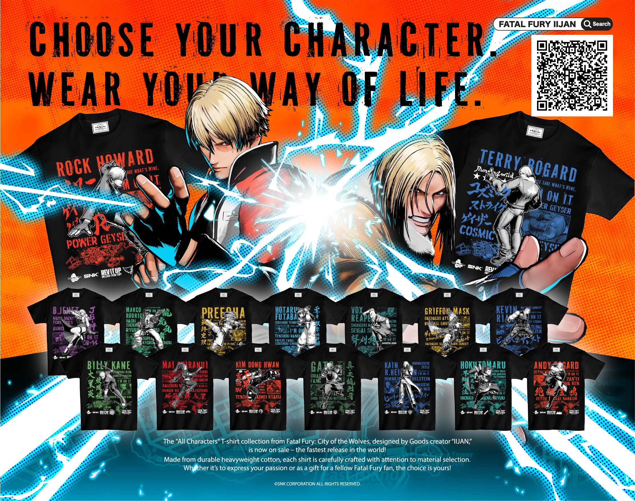 「餓狼伝説 City of the Wolves」に登場する16人のプレイアブルキャラクターをモチーフにした、大胆でスタイリッシュなデザインのTシャツコレクション。